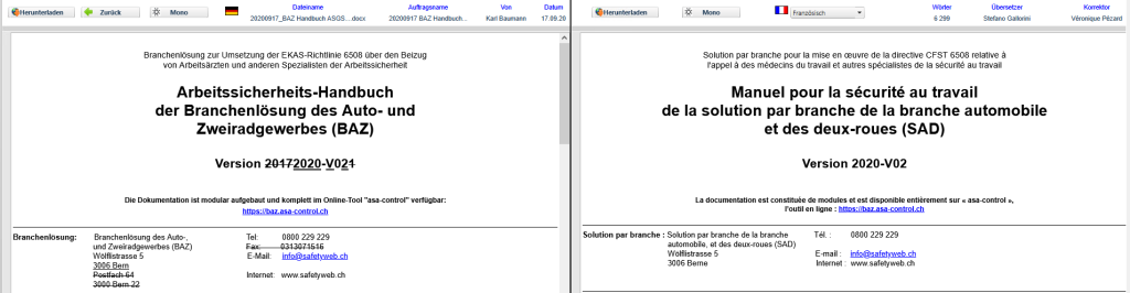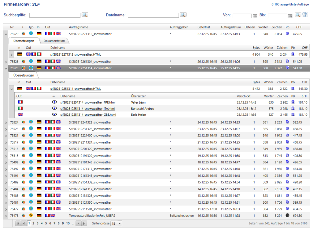 Das Archiv zeigt die Ergebnisse in einer dreistufigen Liste an, die einen schnellen Zugriff auf abgeschlossene oder ausstehende Aufträge ermöglicht. Alle Auftragsinformationen, einschliesslich Dokumentationsdateien, Anleitungen oder XLIFF-Dateien, können mit wenigen Klicks gefunden werden.