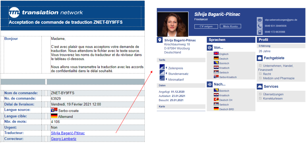 Der Kunde kann – sofern konfiguriert – einen Link zur Übersetzerdatenbank erhalten, über den er auf das Profil der Übersetzer und Lektoren zugreifen kann.