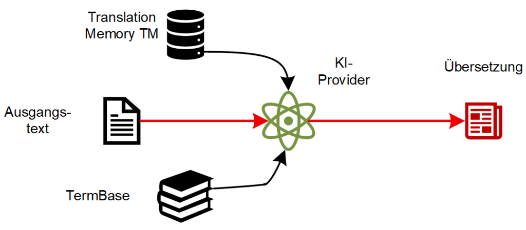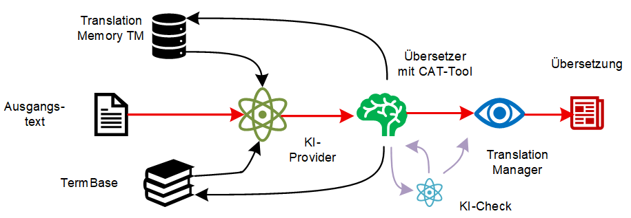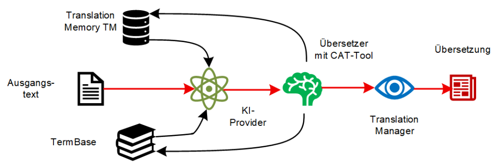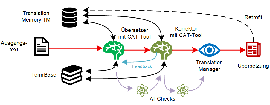 Der Translation Manager stellt sicher, dass der Übersetzer auf die relevanten Ressourcen das heisst das Translation Memory und die Terminologiedatenbank zugreifen kann. Er koordiniert den Arbeitsablauf, damit der Übersetzer den detaillierten Vergleich zwischen Ausgangstext, KI-Ausgabe und den bei der Nachbearbeitung verwendeten linguistischen Ressourcen durchführen kann.