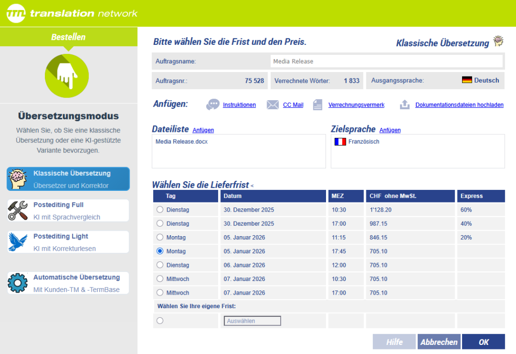 Abbildung 2: Auswahl des Übersetzungsmodus und der Frist