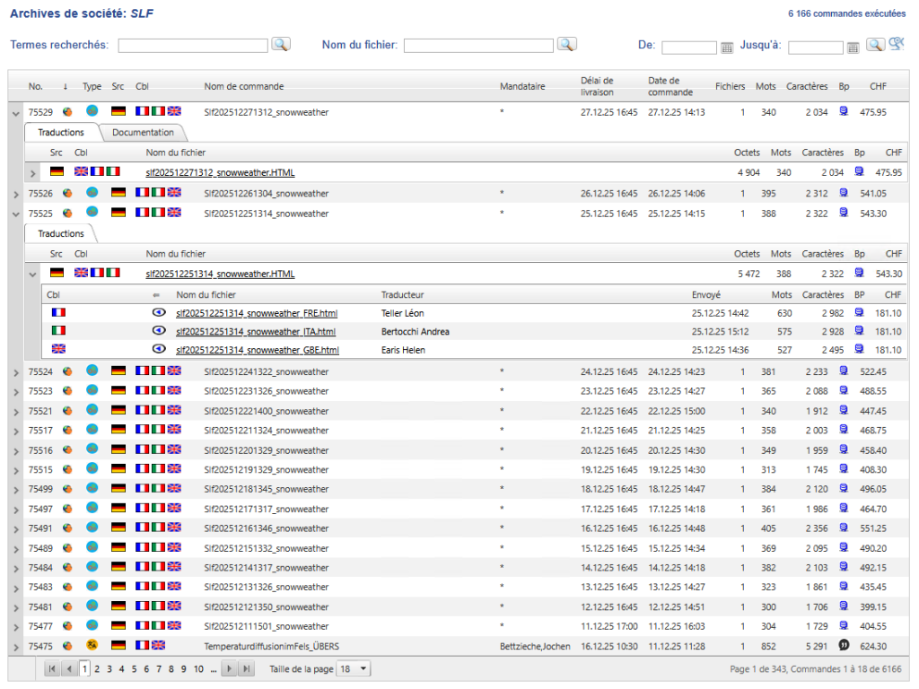 L’archive présente les résultats dans une liste à trois niveaux, ce qui facilite l’accès rapide aux commandes terminées ou en cours. Toutes les informations relatives aux commandes, y compris les fichiers de documentation, les instructions ou les fichiers XLIFF, peuvent être trouvées en quelques clics.