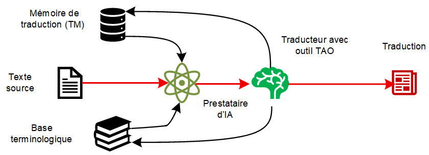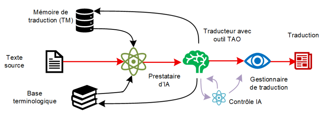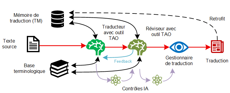 Le responsable de la traduction vérifie également que le traducteur peut accéder aux ressources pertinentes de la mémoire de traduction et de la base de données terminologique, afin de s’assurer que le travail linguistique est effectué avec les données de référence correctes. Il coordonne le flux de travail afin que le traducteur puisse effectuer la comparaison détaillée entre le texte source, la sortie AI et les ressources linguistiques utilisées lors de la post-édition.