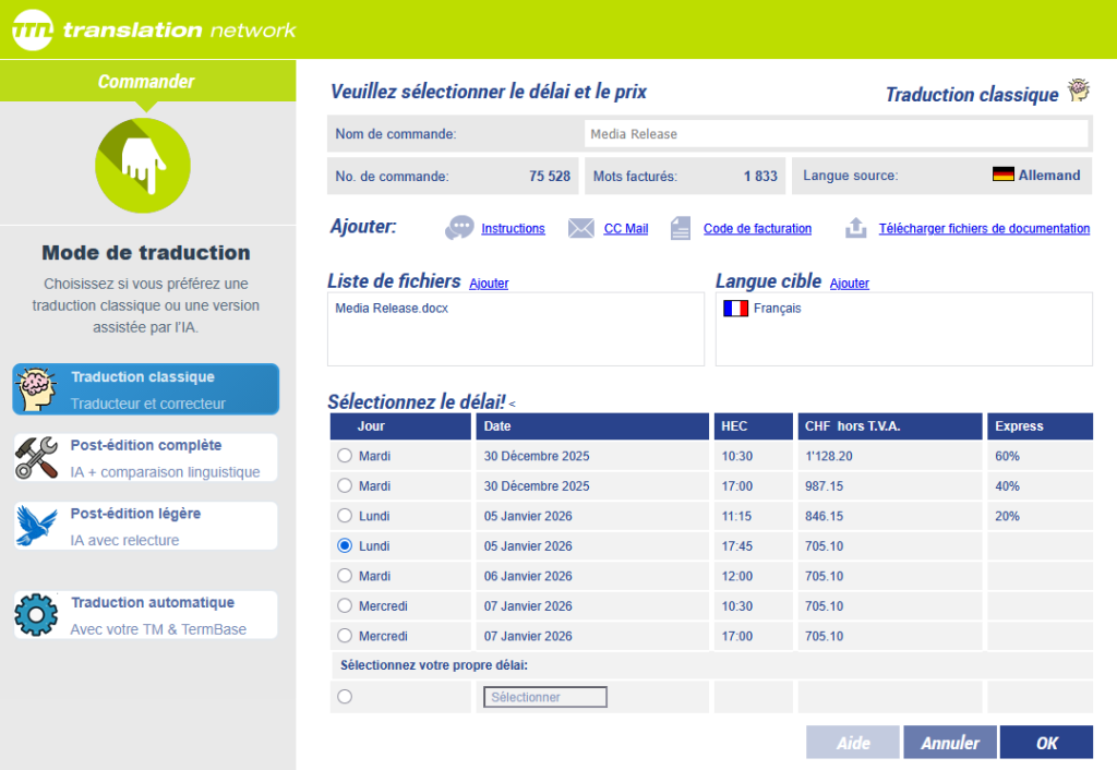 Les factures sont envoyées par courrier électronique au format PDF. Elles sont également accessibles en ligne, ce qui assure une transparence totale et permet de vérifier le nombre de mots ainsi que de confirmer l’exactitude et la conformité réglementaire des montants facturés. Les factures sont générées dans des formats spécifiques à chaque pays ; en Suisse, par exemple, un code QR est requis conformément aux normes de facturation locales.