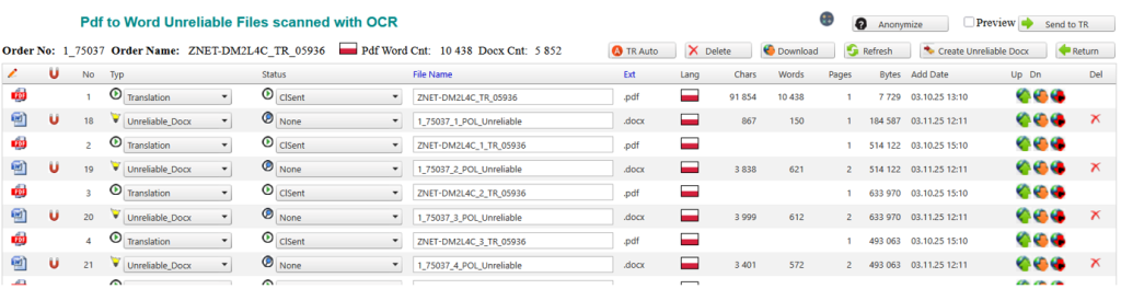 PDFs are treated as a special case. Although text can be translated directly by Trados, in most cases it is preferable to convert PDFs into Word. TTN TMS distinguishes between scanned PDFs and digital PDFs. Digital PDFs are generated from digital sources (for example, Word, InDesign or CAT tools); their text is already selectable and editable, so no OCR is needed. TTN TMS converts all PDF files automatically into Word files using Abbyy FineReader.
