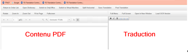 This is a lightweight online editor (built with Telerik UI components) ideal for small documents or short texts. The translator accesses a web page with two adjustable panes: one pane displays the original PDF and the other provides an input area for the translation. The interface is designed to be extremely easy to use, even for a translator who has never seen it before.