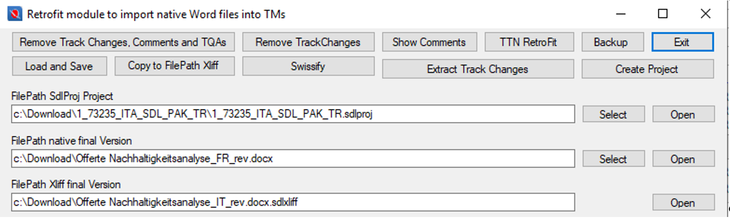 One of these tools is the Retrofit tool. Many translations from universities and other institutions include scientific or political papers written by bilingual specialists. Similarly, many Swiss federal offices have internal language departments that review outsourced translations once they are submitted. These specialists revise the translated papers and add valuable improvements and terminological precision, especially for scientific literature. Unfortunately, they often do not use CATT tools, and their corrections are made only in Word—frequently without proper track changes—and are sent back as feedback to the translation headquarters. This is where RetroFit becomes essential. Since the retrofit process in Trados cannot be automated, the automatic Retrofit tool of the TTN TMS takes over.