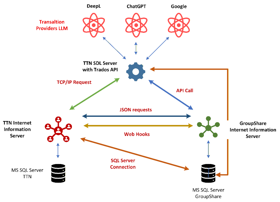 TTN TMS utilises a dedicated application called TTN SDL Server to abstract away the complexity of the GroupShare interface. This specialised TCP/IP server acts as an intermediary between TTN’s web portal and the GroupShare platform, automatically handling user requests (e.g., new project creation, translation memory integration, user permission management).