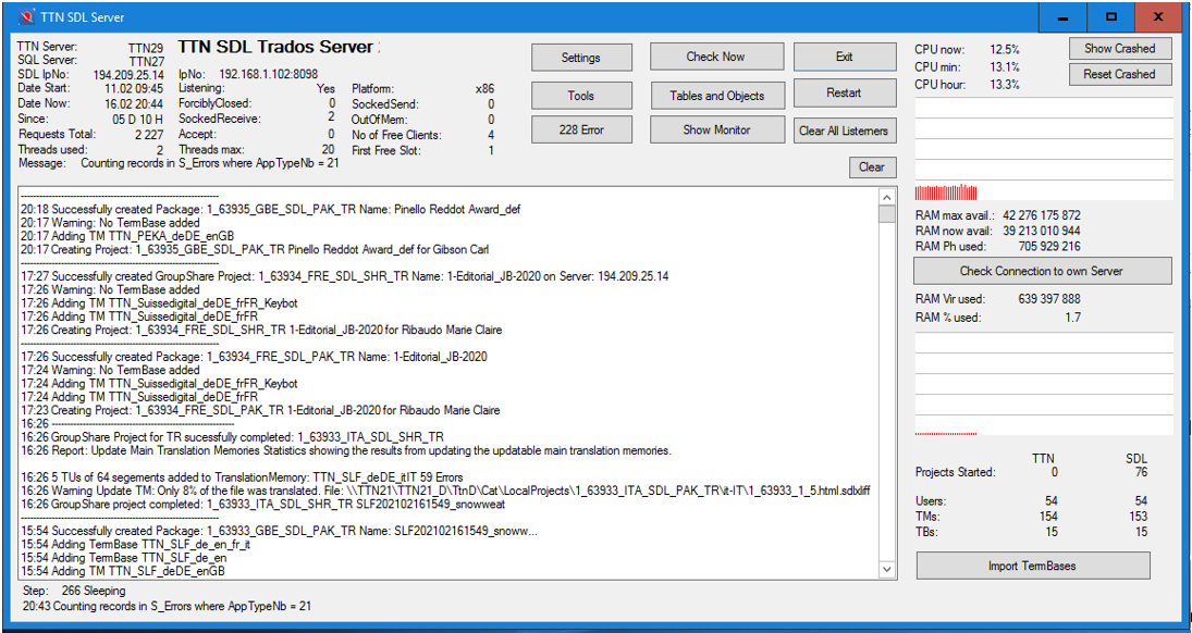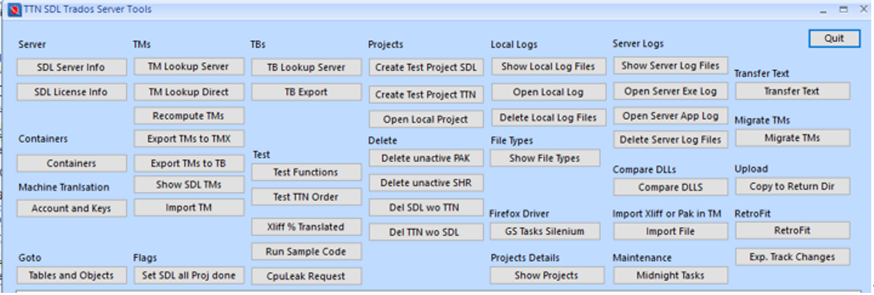 TTN-SDL is the centrepiece of the system. It answers terminology and Translation Memory requests, and exports and imports Termbases and translation memories.